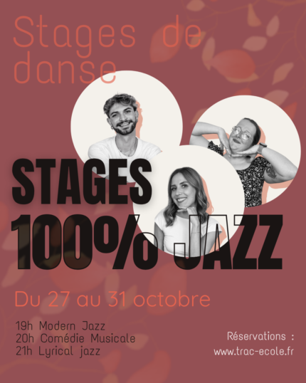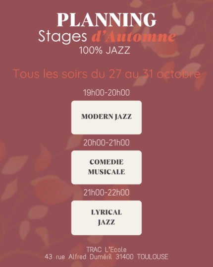 Accueil / Stages / Stages d’Automne 100% Jazz Stages d’Automne 100% Jazz0.00€ La spécialité du TRAC, des stages sur 1 semaine qui vous permettent de decouvrir à moindre coût une danse ou un style. Nombre de cours1 cours (80.00€)2 cours (150.00€)3 cours (195.00€)0.00€Choix du CoursModern Jazz 19HComedie Musicale 20h Lyrical JazzChoix des Cours (choisir 2 cours)Modern Jazz 19HComedie Musicale 20h Lyrical JazzChoix des Cours (Choisir 3 cours)Modern Jazz 19HComedie Musicale 20h Lyrical Jazz Total: 0.00€ quantité de Stages d'Automne 100% Jazz Ajouter au panier x Catégorie : Stages Produit ID :16179 Description Description Des stages de Jazz tous les soirs sur 1 semaine, du lundi au vendredi.