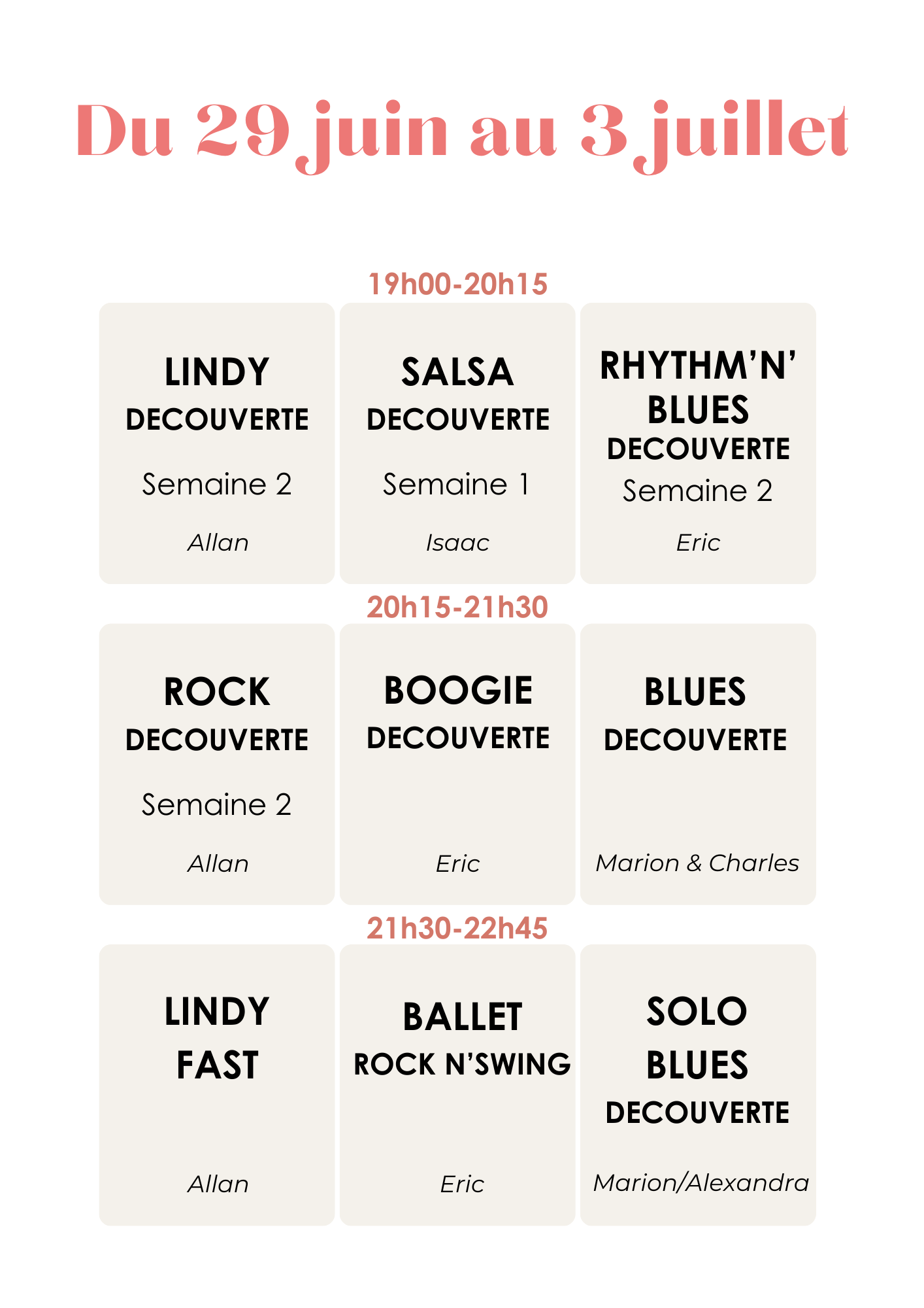 Ballet Rock N’Swing : Venez vous challenger sur un enchainement en couple et en formation, et vivre la magie d’une réalisation de chorégraphie pour la scène. Niveau de danse requis : 1 an minimum.