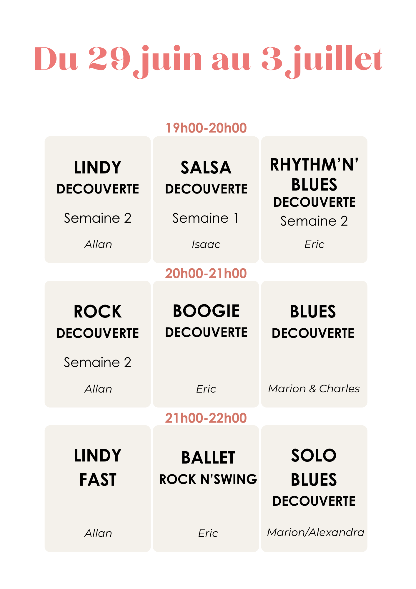 Ballet Rock N’Swing : Venez vous challenger sur un enchainement en couple et en formation, et vivre la magie d’une réalisation de chorégraphie pour la scène. Niveau de danse requis : 1 an minimum.