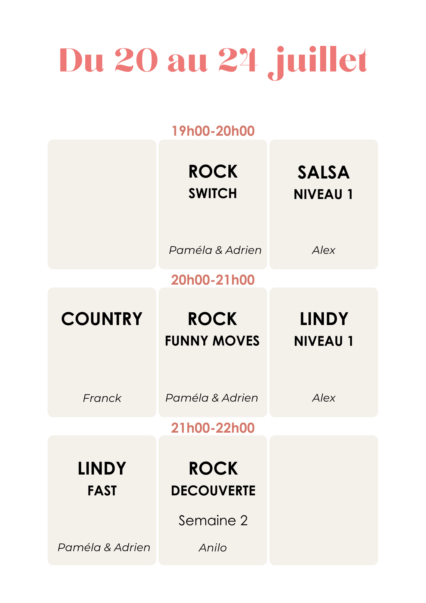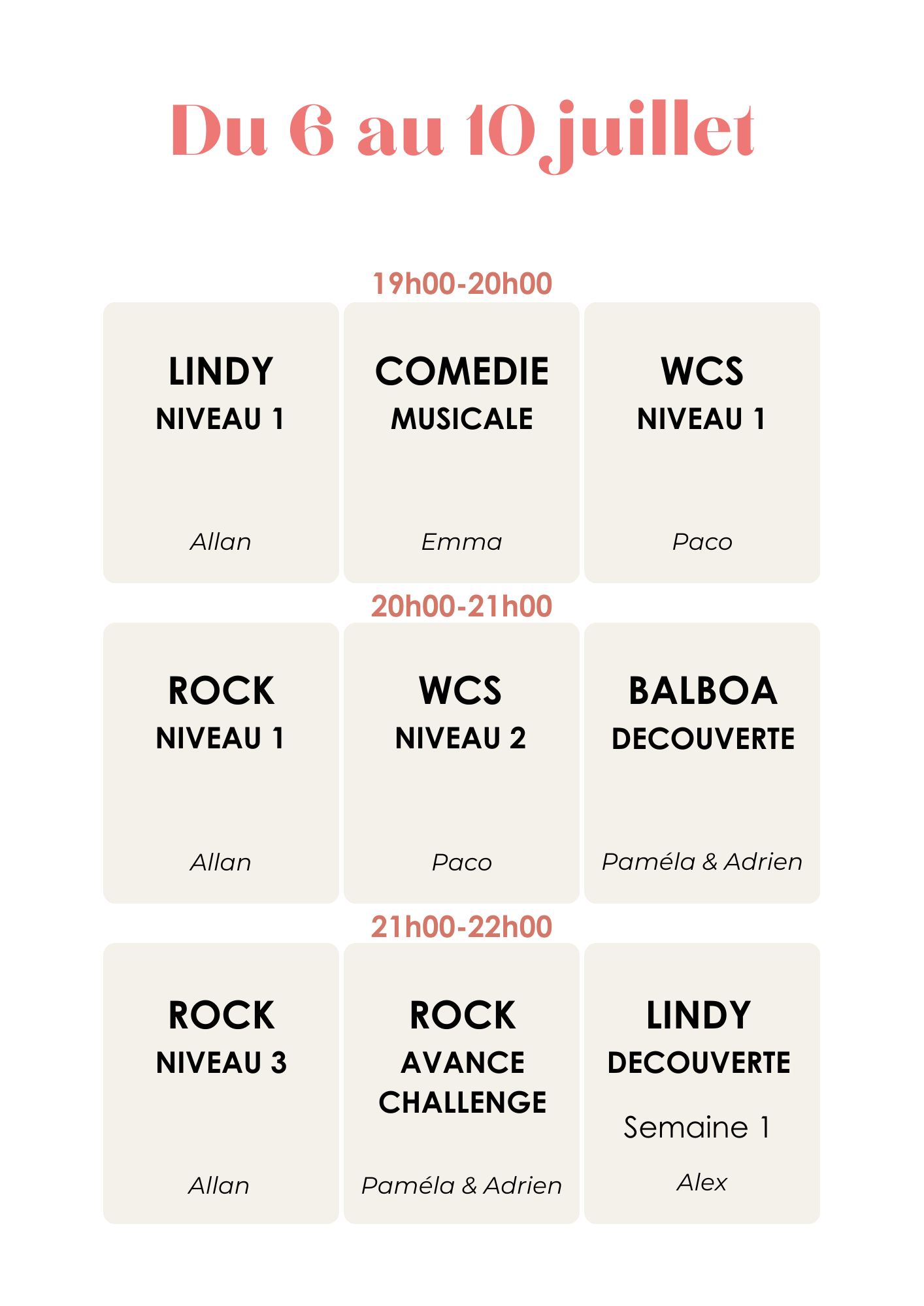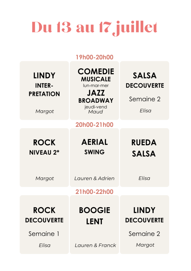 Ballet Rock N’Swing : Venez vous challenger sur un enchainement en couple et en formation, et vivre la magie d’une réalisation de chorégraphie pour la scène. Niveau de danse requis : 1 an minimum.