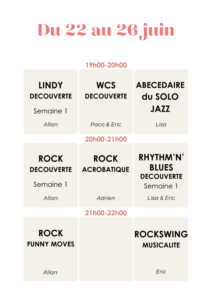 Abécédaire du Solo Jazz : Envie de maîtriser le vocabulaire du Solo Jazz ? De l’Apple Jack au Zulu Wig, rejoignez-nous pour un tour d’horizon complet des variations jazz. A travers un voyage alphabétique de l’histoire du Jazz Roots, venez construire votre propre lexique corporel. Chaque séance explore les variations emblématiques du Solo Jazz en suivant l’ordre de l’alphabet. L’Objectif : Enrichir votre « bibliothèque de pas » pour ne plus jamais être à court d’idées en improvisation sociale.